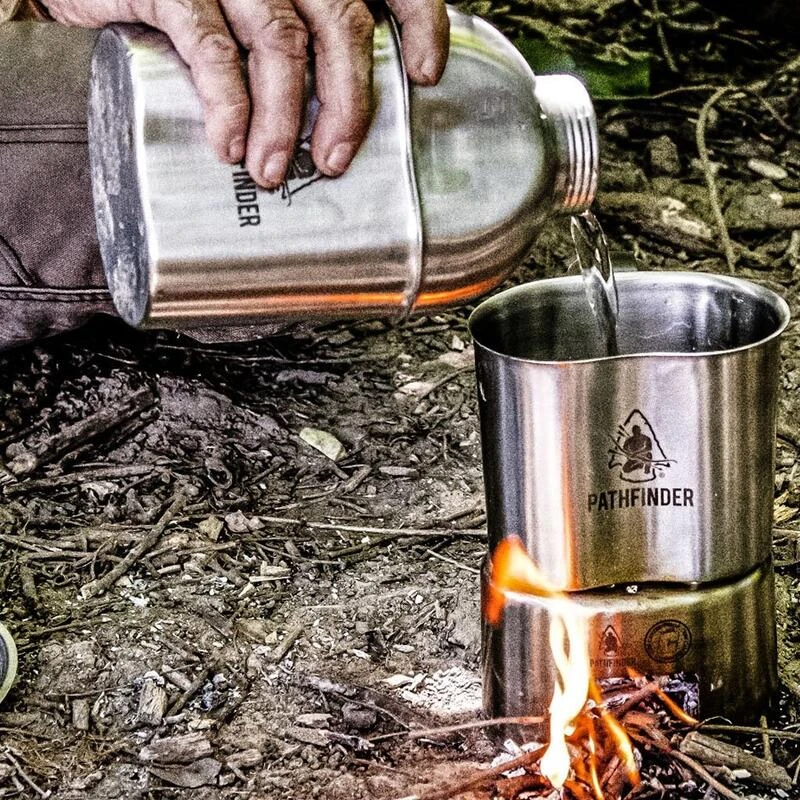 Le kit de cuisine camping Pathfinder RVS est parfait pour la cuisson en extérieur. Il comprend une flasque large à 1,15L, une casserole de 0,7L avec un couvercle et un réchaud. Toutes les piÚces