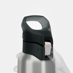 Le bouchon s’ouvre facilement Ă une main en appuyant sur le bouton blanc Ă l’endroit marquĂ© « PRESS ». Lors du transport il est possible de verrouiller ce bouton en glissant le bouton blanc vers le bas. Un espace rouge apparaĂźt alors indiquant que le bouchon est verrouillĂ© et il n’est plus possible d’appuyer.