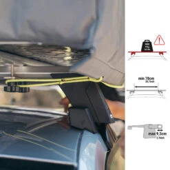 La largeur utile est de 78cm, la distance entre le toit et le haut de la barre de toit doit être supérieure à 7,5cm et la largeur du tube de la barre de toit doit être inférieure à 9,5cm (voir les schémas sur les photos de cette fiche produit).