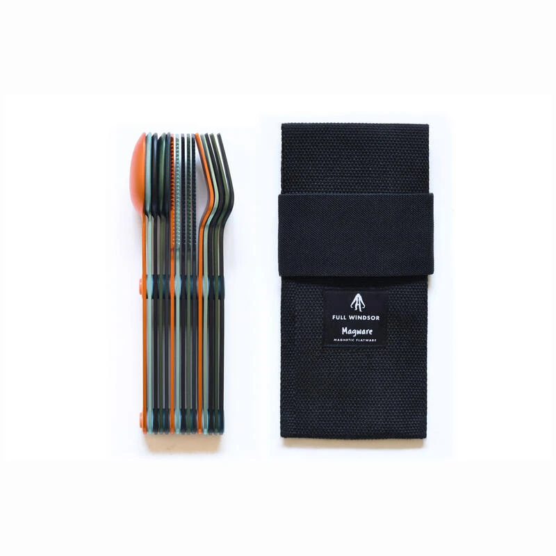 5 Fourchettes magnétiques 5 Couteaux magnétiques 5 Cuillères magnétiques 1 Étui en polyester recyclé